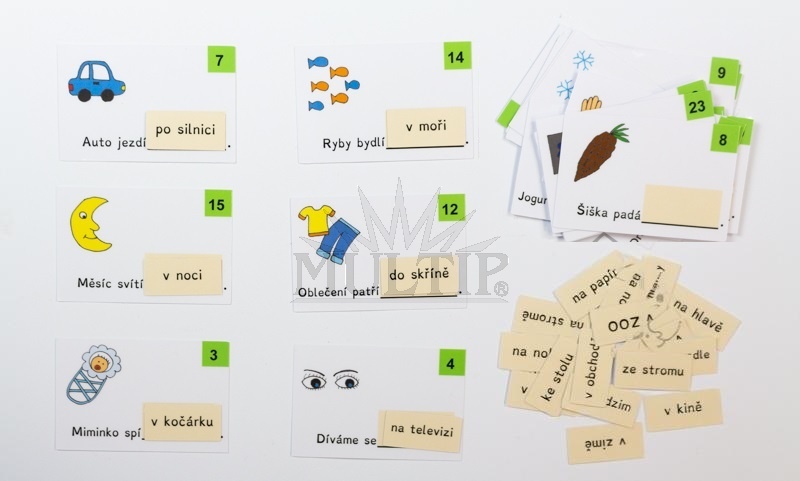 Sada obsahuje 24 velkých kartiček s neúplnými větami a 24 malých kartiček s různými předložkami, které děti doplňují do vět. K dispozici jsou také 4 velké karty s kompletními větami pro kontrolu.