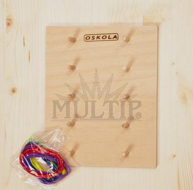 Sada obsahuje dřevěnou desku s deseti dřevěnými kolíčky a barevné gumičky (4 x 5 barev, celkem 20ks).