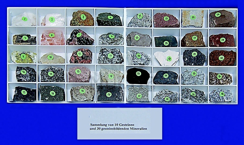 Sbírka obsahuje kombinaci 10 horninotvorných minerálů a 30 hornin, vysvětluje nejdůležitější souvislosti petrografie a umožňuje žákovi samostatné vypracování prvních úkolů pro určení hornin. Velikost každého kusu: 2 × 2 cm. Kolekce je dodávána ve 2 robustních plastových boxech s přihrádkami. Jednotlivé kusy minerálů jsou velké zhruba 2 × 2 cm a jsou označeny čísly odpovídajícími seznamu.