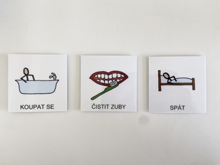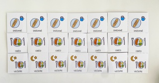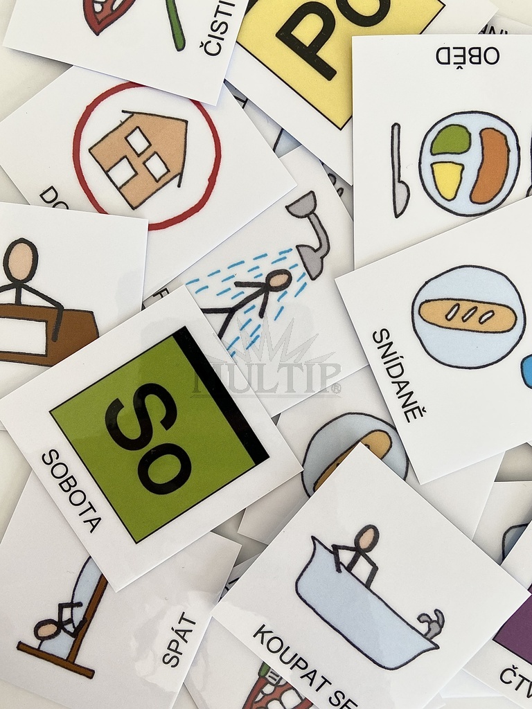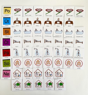 - Komunikační kartičky pro děti s poruchou komunikace, které pomáhají se zorintovat v režimu týdne.