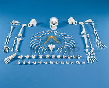 Všechny kosti kostry jsou zobrazeny jednotlivě. Model představuje dospělého muže. Realistická struktura kostí s otvory, stěrbinami a výběžky. Lebka může být rozdělena na tři části: základnu lebky, klenbu a dolní čelist.