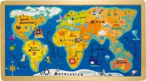 Mapa světa obsahuje 24 dřevěných barevných dílků.
