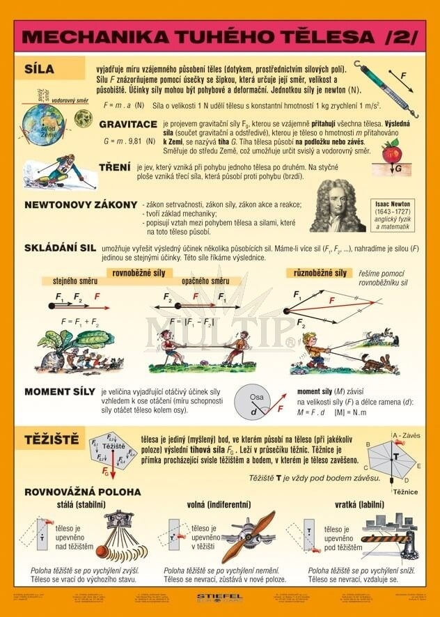 Oboustranná didaktická pomůcka ze souboru “mechanika tuhého tělesa” I. díl je věnována vysvětlení pojmů mechanika, tuhé těleso, pohyb těles, pohyb rovnoměrný a nerovnoměrný, přímočarý a křivočarý a vysvětlení vztahů mezi rychlostí, dráhou a časem. Cílem názorného, s praktickým životem spojeného, vhodně a přiměřeně ilustrovaného provedení didaktické pomůcky je, aby se náročné učivo o zákonitostech přírodních procesů stalo pro žáky jednodušší a srozumitelné.