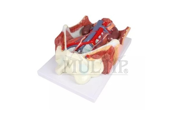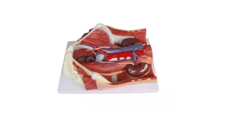 Model močového systému pro dvojí pohlaví poskytuje komplexní pohled na močový systém, který představuje struktury retroperitoneální dutiny, velké a malé pánve s kostmi a svaly, dolní duté žíly, aorty s jejími větvemi, včetně kyčelních cév, horních močových cest, konečníku a ledvin s nadledvinami.
