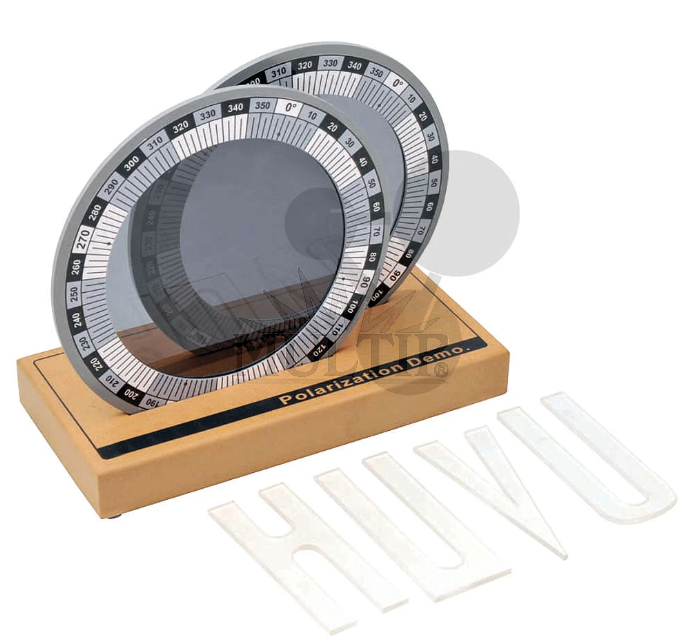 Demonstrační model se skládá ze dvou kruhových polarizačních filtrů o průměru 125 mm, uložených v rámu se stupnicí na dřevěném stojanu. Detailní informace