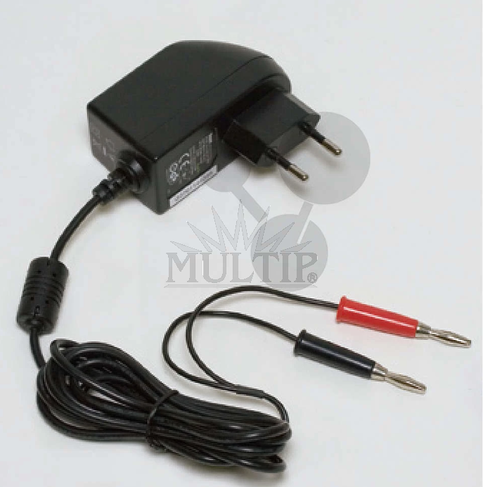 V plastovém pouzdře se síťovým konektorem a dvoužilovým připojovacím kabelem se 4mm konektory.