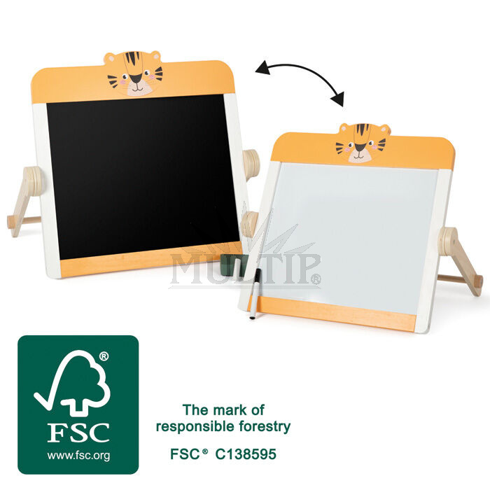 - Křídová a magnetická tabule je vyrobena z odolného dřeva s certifikací FSC® a zve děti ke kreslení, psaní prvních písmen nebo počítání jednoduchých příkladů.