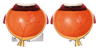 Model v 6-ti násobné životní velikosti lze vodorovně rozdělit pro demonstraci vnitřních detailů oka.