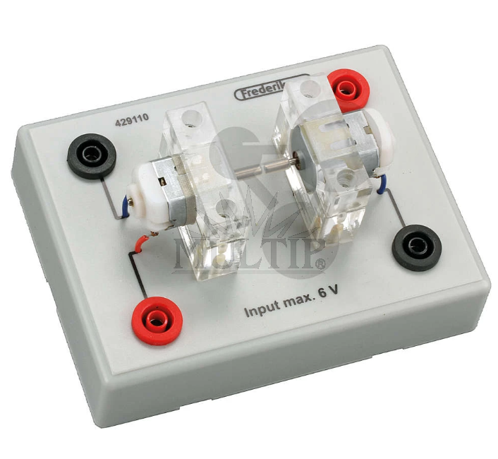 Jeden motor otáčí druhý, který působí jako generátor. Gumové nožičky, zapojení 4 mm bezpečnostními zdířkami.