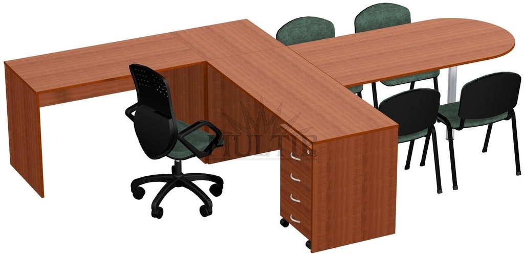 Kancelářský stůl tvaru L se čtyřzásuvkovým kontejnerem a přístavným jednacím stolem pro 4 osoby