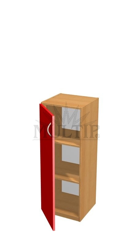 Jednodveřová skříň se dvěma policemi a barevnými dvířky.