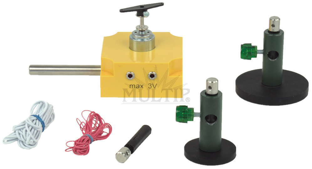 Souprava přístrojů k sestavení a dosažení stojatého příčného vlnění, s jednoznačným rozpoznáním uzlů a polovln a se změnou jejich počtu při různých budících frekvencí na magnetické tabuli (není součástí soupravy). Detailní informace