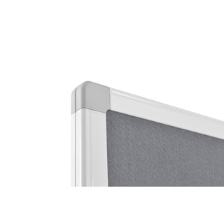 Moderační oboustranná tabule s plstěným šedým povrchem umístěná v elegantním rámu z eloxovaného hliníku s šedými plastovými rohy.
