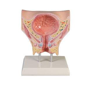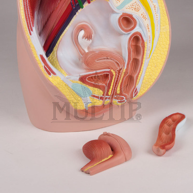Anatomický model ženské pánve v životní velikosti je rozdělen na střední sagitální rovině a zobrazuje ženské pánve ve třech částech. Kromě svalů a cévního zásobení břišní dutiny model ukazuje zejména urogenitální orgány. Polovina močového měchýře, dělohy a pochvy a polovina střeva s konečníkem lze odejmout.